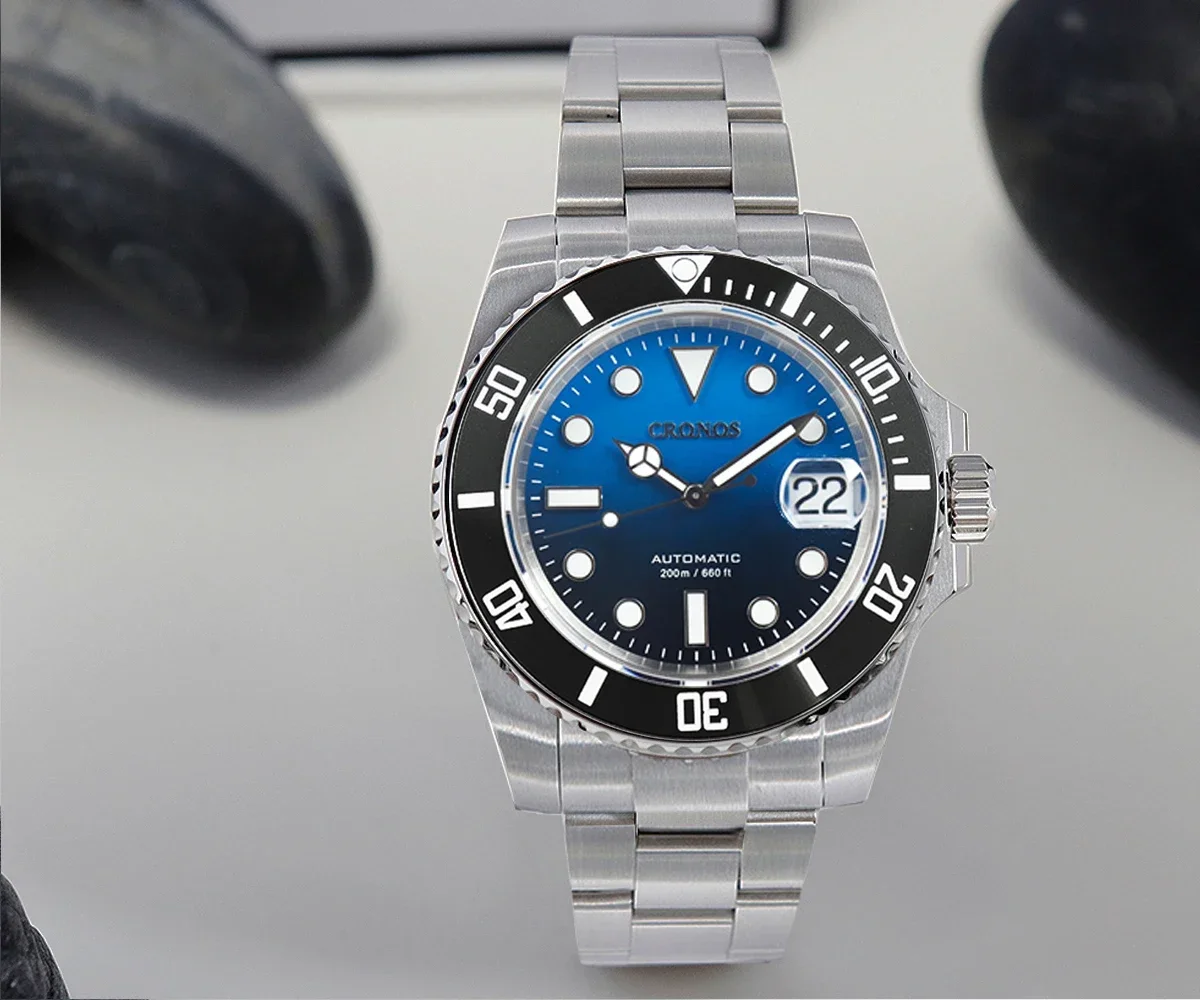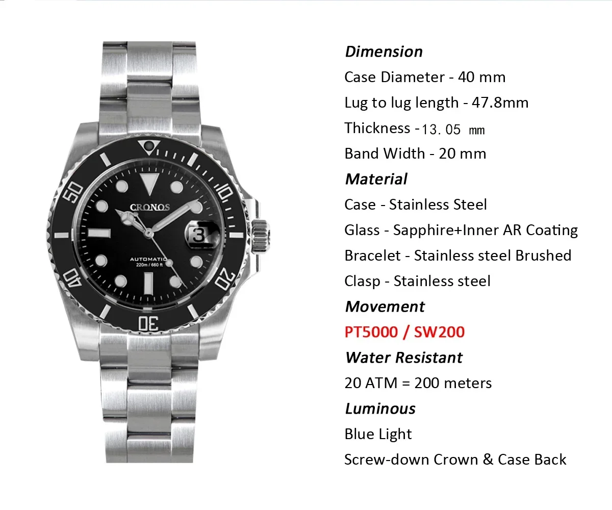 A very well done circa 2020 submariner homage by cronos, excellent finishing, the best glidelock style clasp i've used, excellent bezel action, silky smooth crown, good lume, beautiful deep black dial, +2/3 spd fro the pt5000 delivery took a couple of weeks to the uk, first class customer service