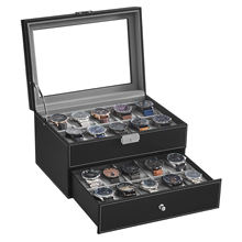 SONGMICS Glint-20™ – 2-Layer Black Watch Vault, 20-Slot Glass-Top Case, Lockable Synthetic-Leather Box, Stackable Display for Men & Women