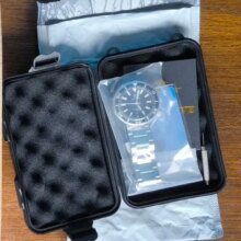 On-time delivery. Good steel box with nice brushed finish. The ceramic bezel is very noticeable. Size amount.