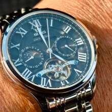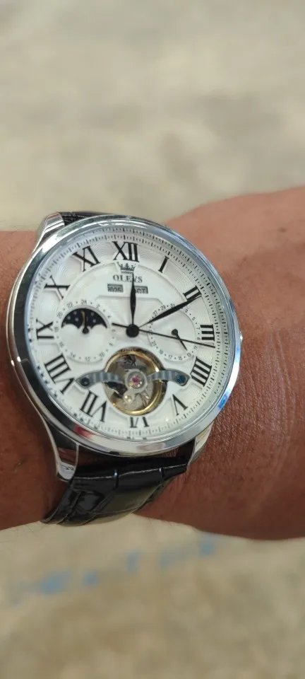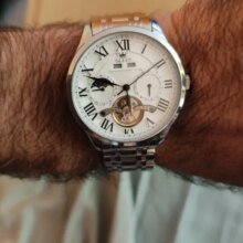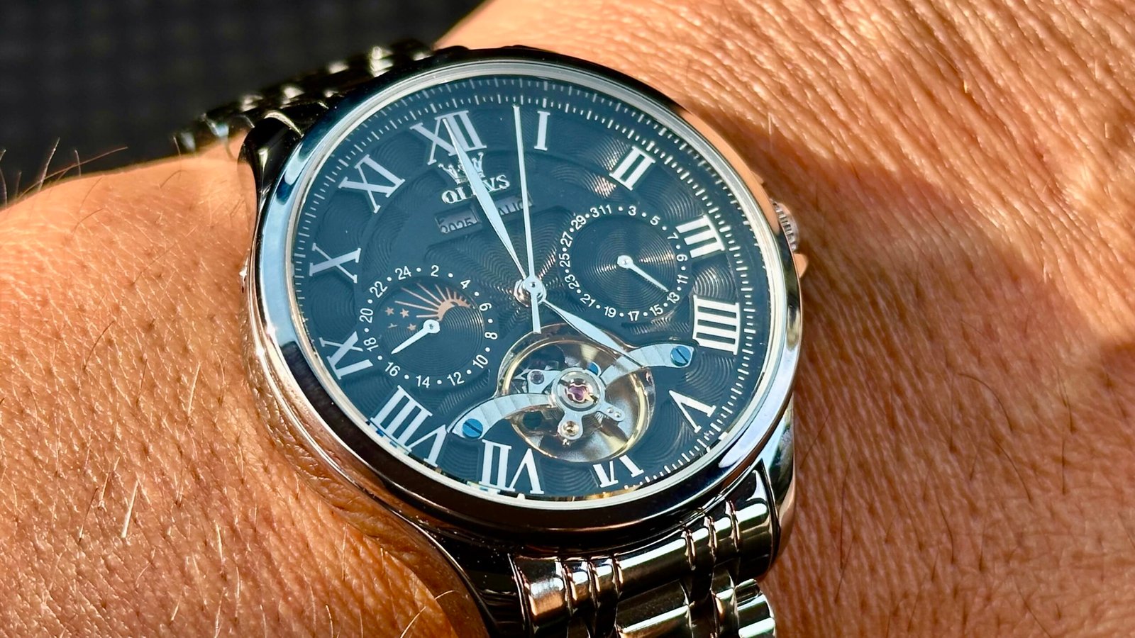 - Open-heart flywheel – 21-jewel automatic caliber, 21,600 vph; balance wheel floats at 12 o’clock like a beating star.