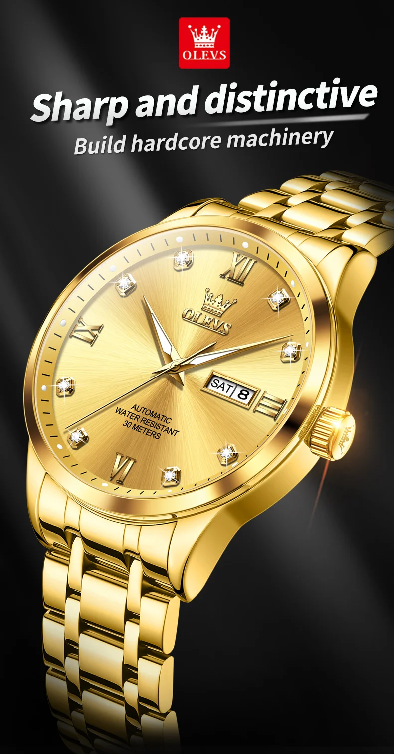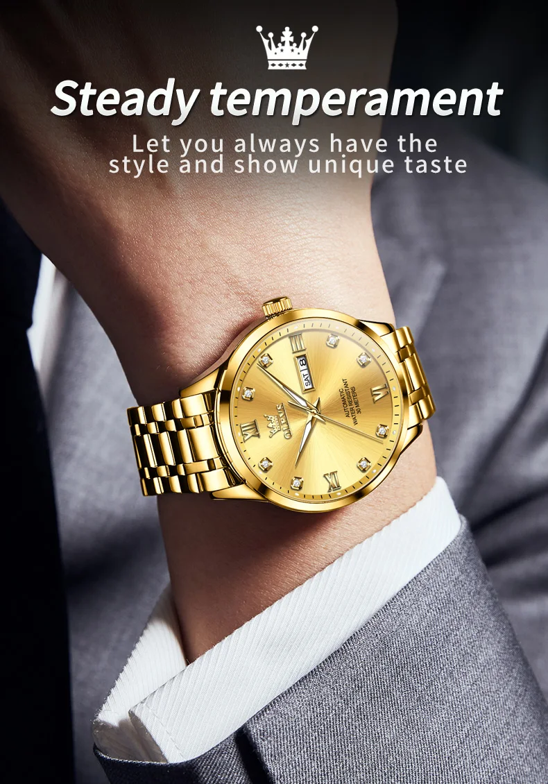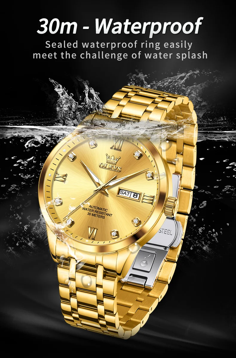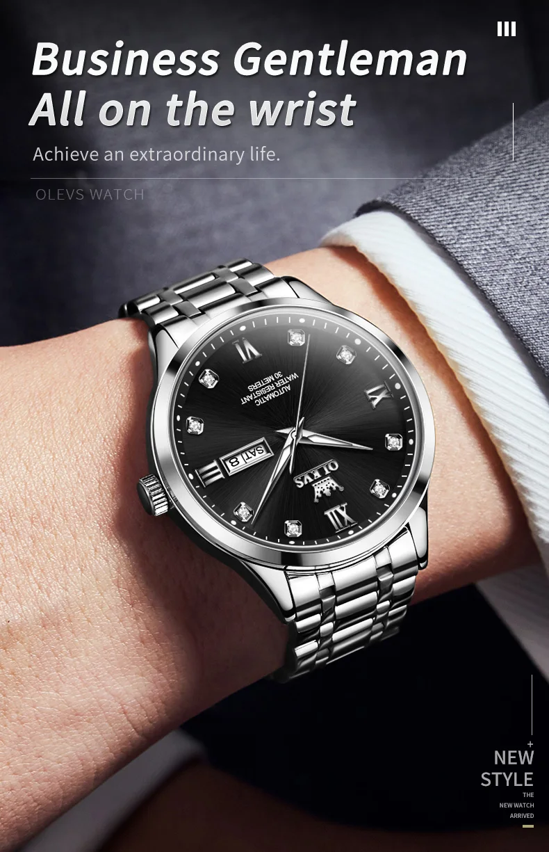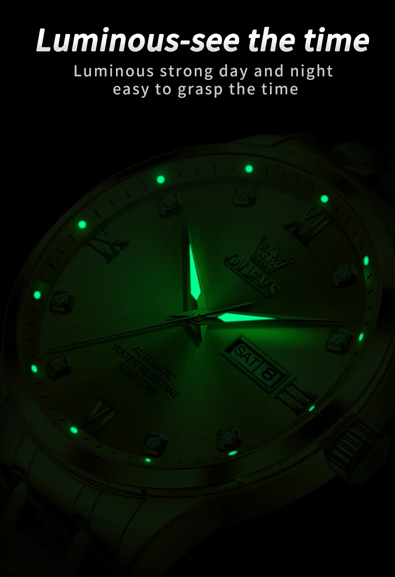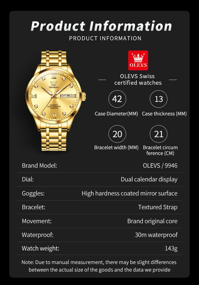 - OLEVS-factory automatic movement – 21-jewel, 42 h power reserve, hacking & hand-wind; visible through sapphire-window case-back.