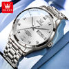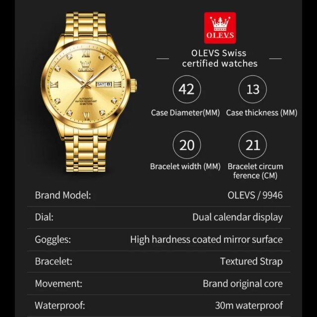 - OLEVS-factory automatic movement – 21-jewel, 42 h power reserve, hacking & hand-wind; visible through sapphire-window case-back.