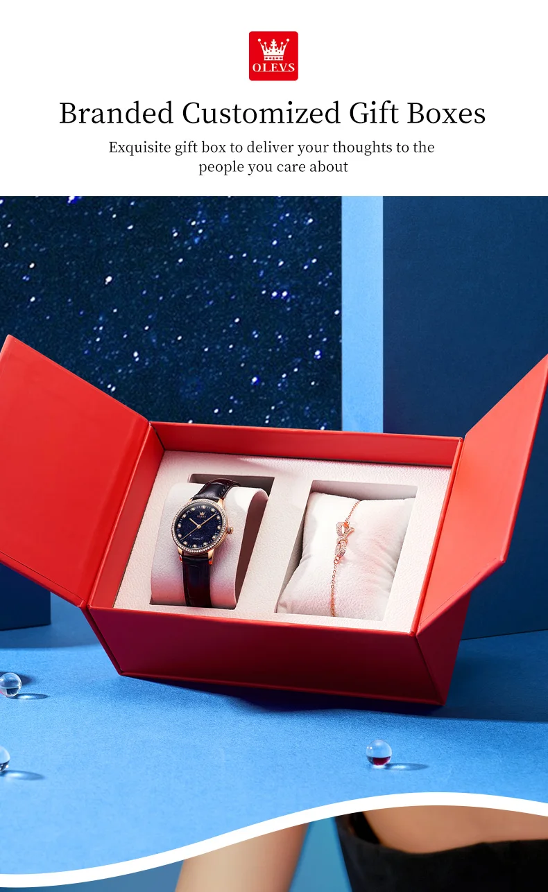 • Signature OLEVS gift suite – magnetic velvet box, polishing cloth, warranty card and gift tag—no extra wrapping needed.