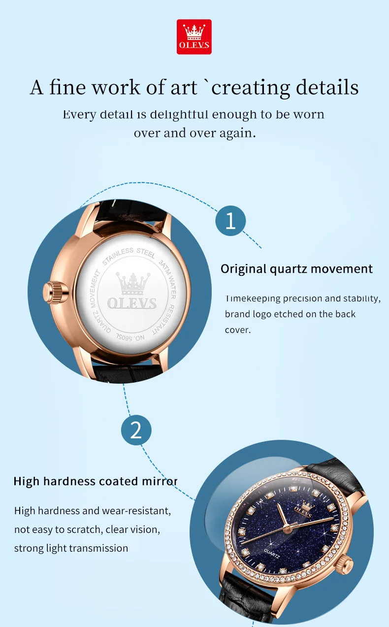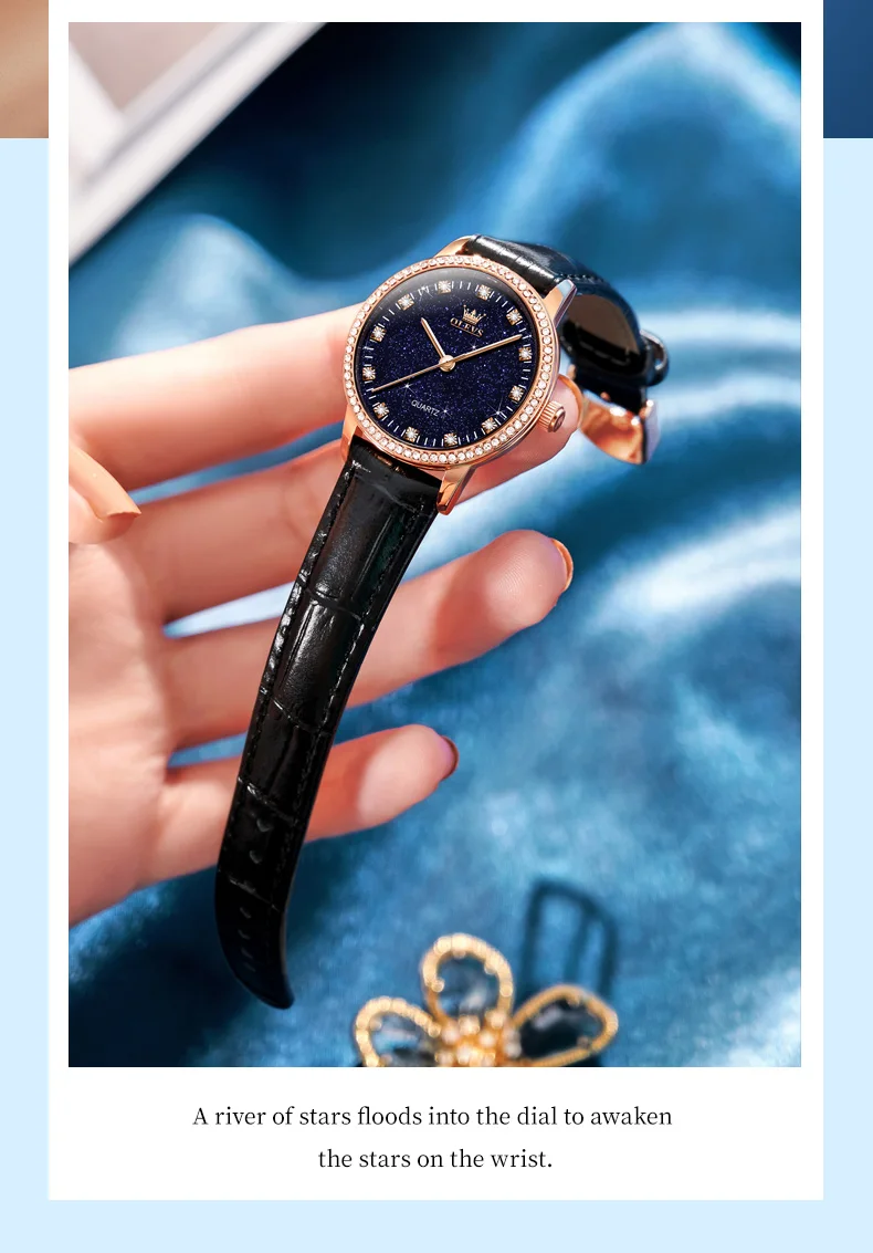 • OLEVS-original star-dust dial – each deep-blue aventurine face is unique, shot with micro-copper flecks for live sparkle in any light