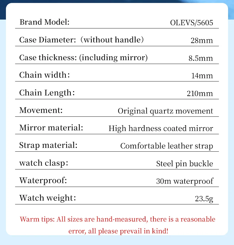 • Japan quartz movement – OLEVS-factory calibrated to ±15 s/month; battery pre-installed, 2-year life.