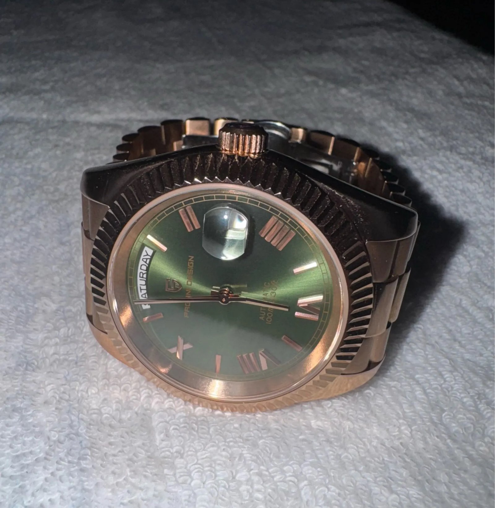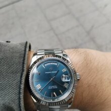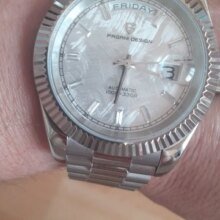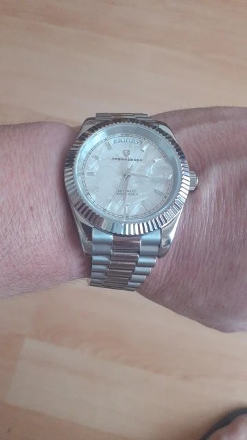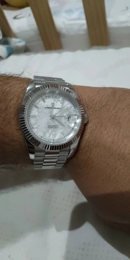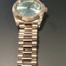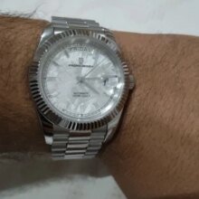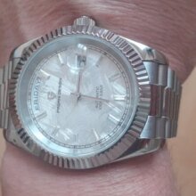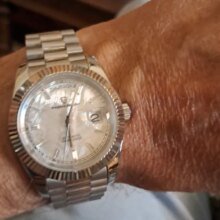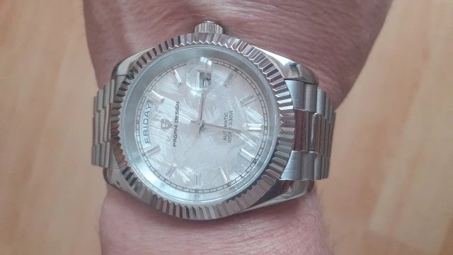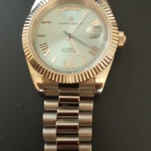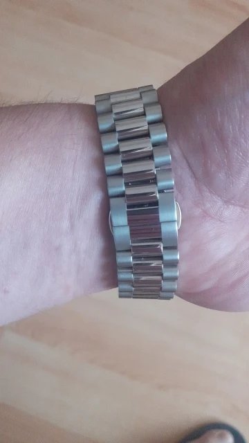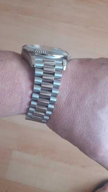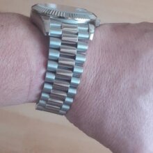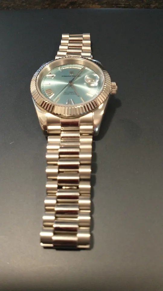 Beautiful watch well worth the money i really like the band it's comfortable and the pins are screw in pins normally in a high grade watch band looks just like the rolex day date