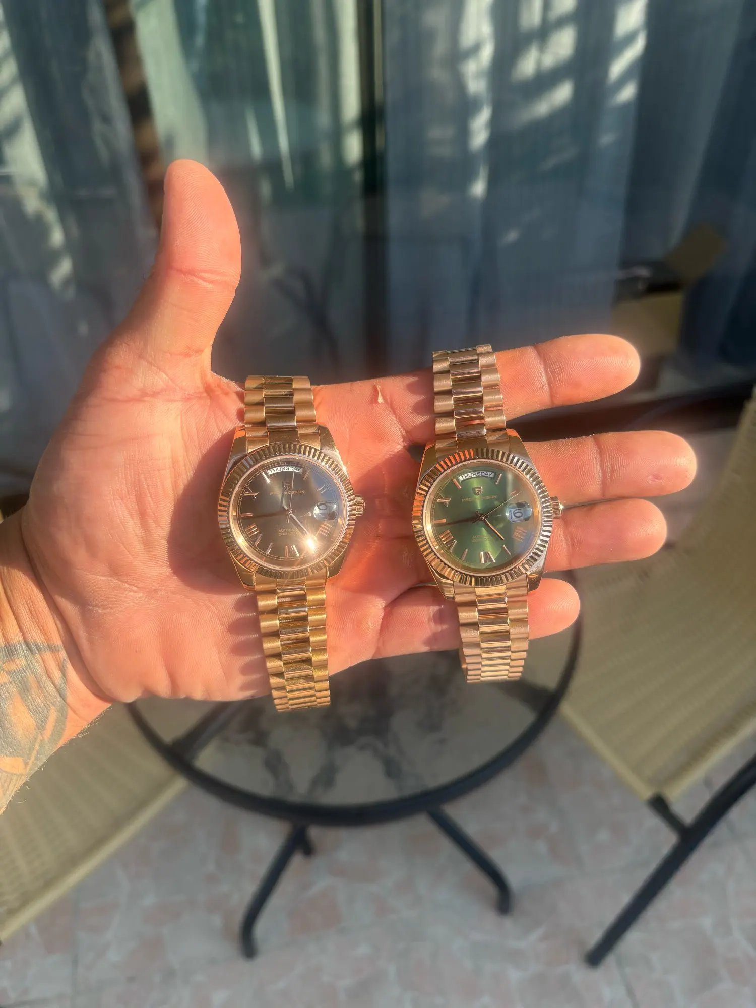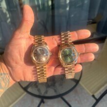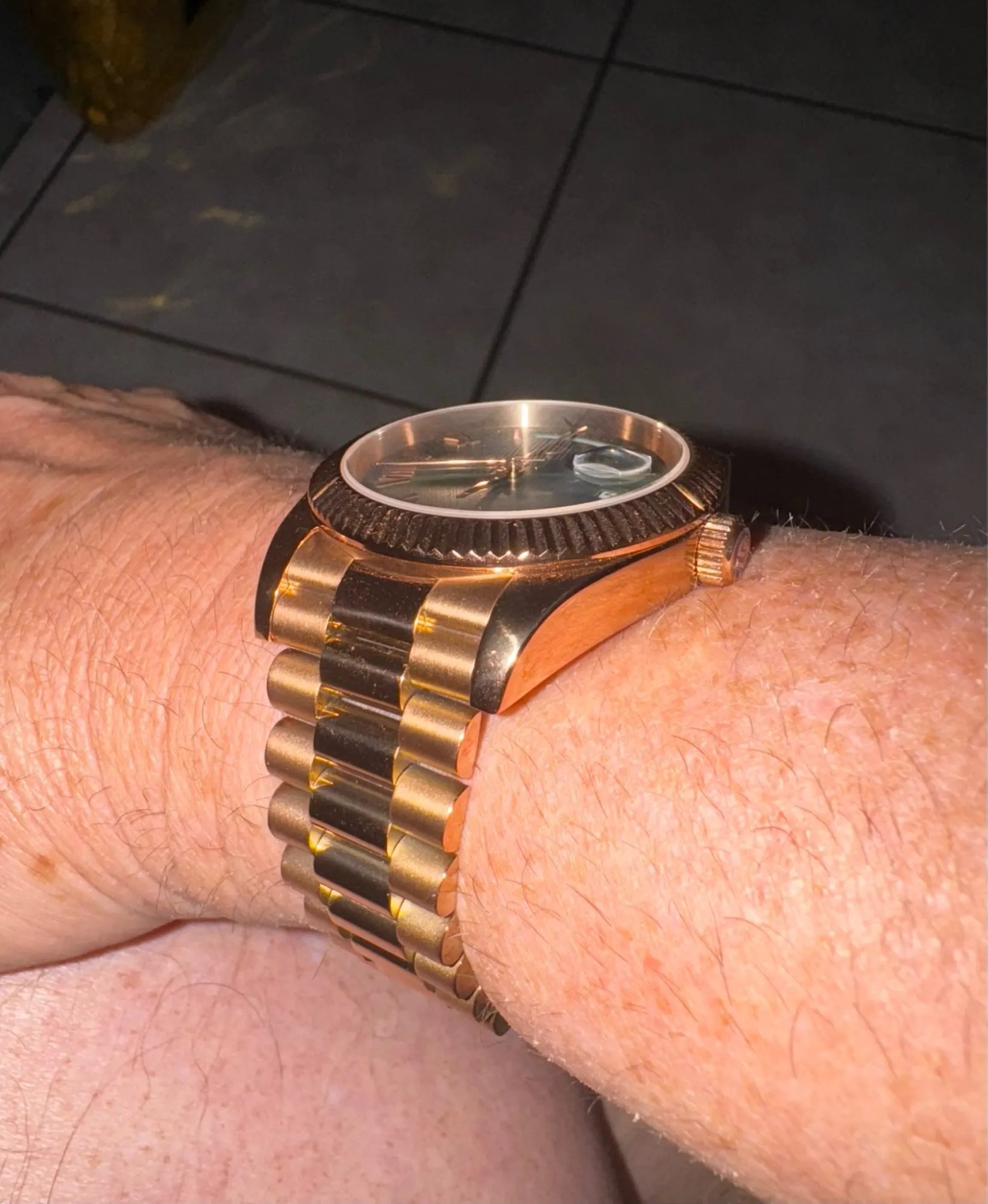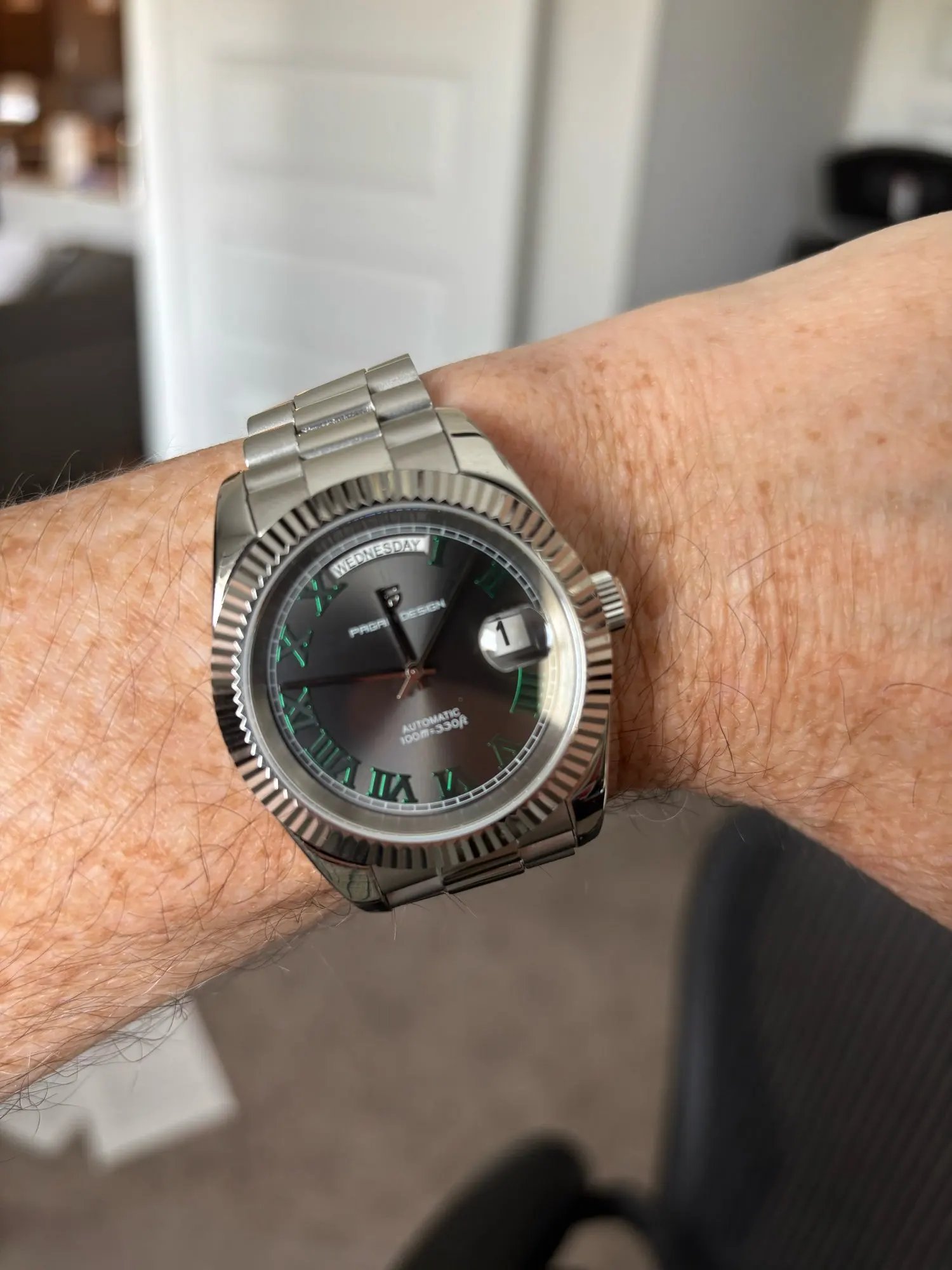 Beautiful watch well worth the money i really like the band it's comfortable and the pins are screw in pins normally in a high grade watch band looks just like the rolex day date