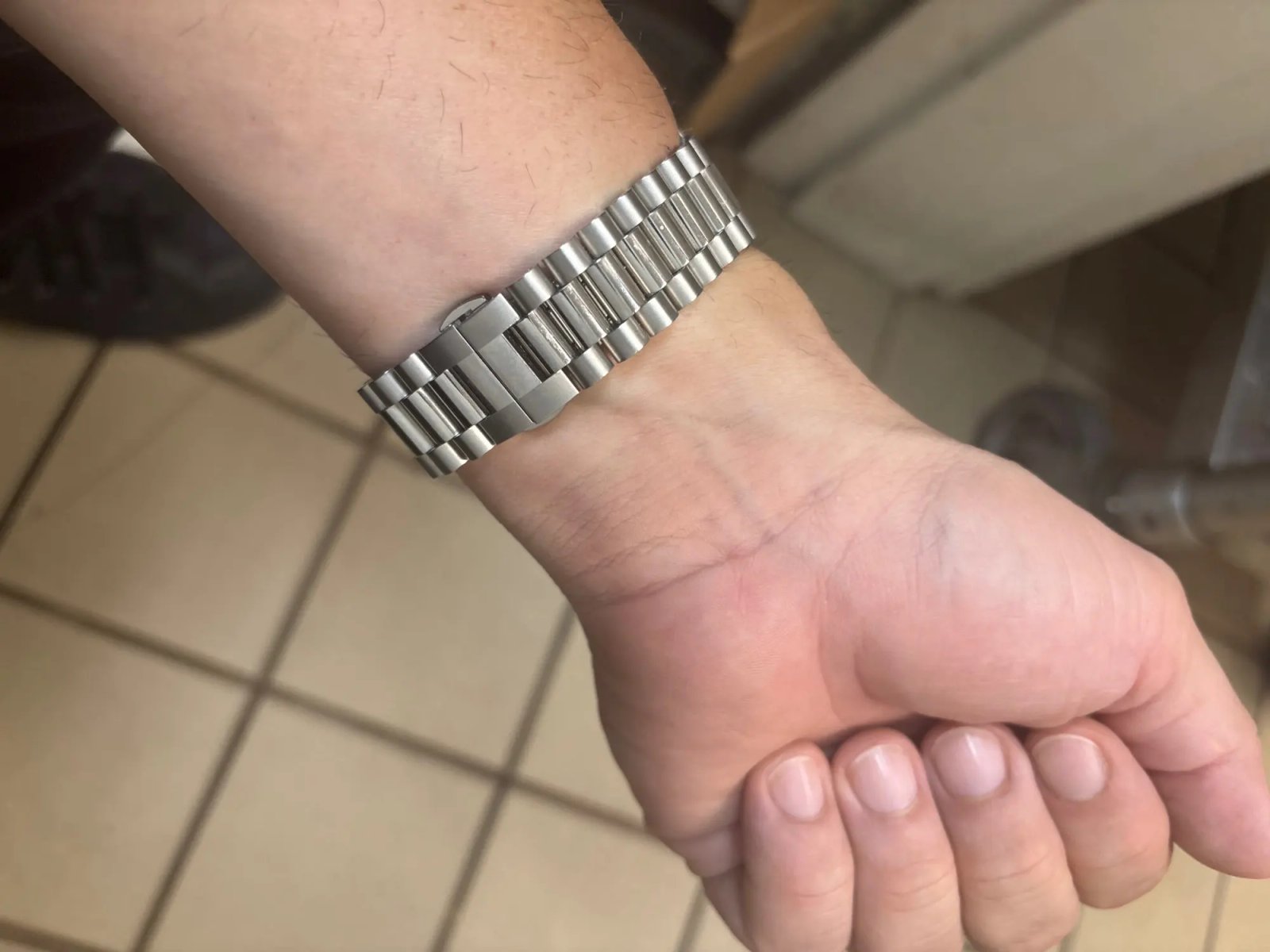 - Solid steel President bracelet – 21 mm, brushed + polished, folding clasp.