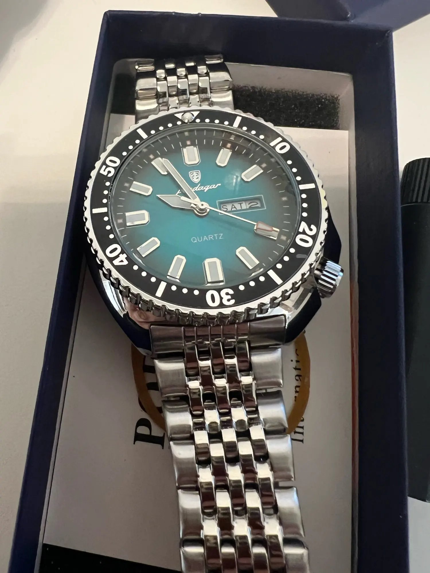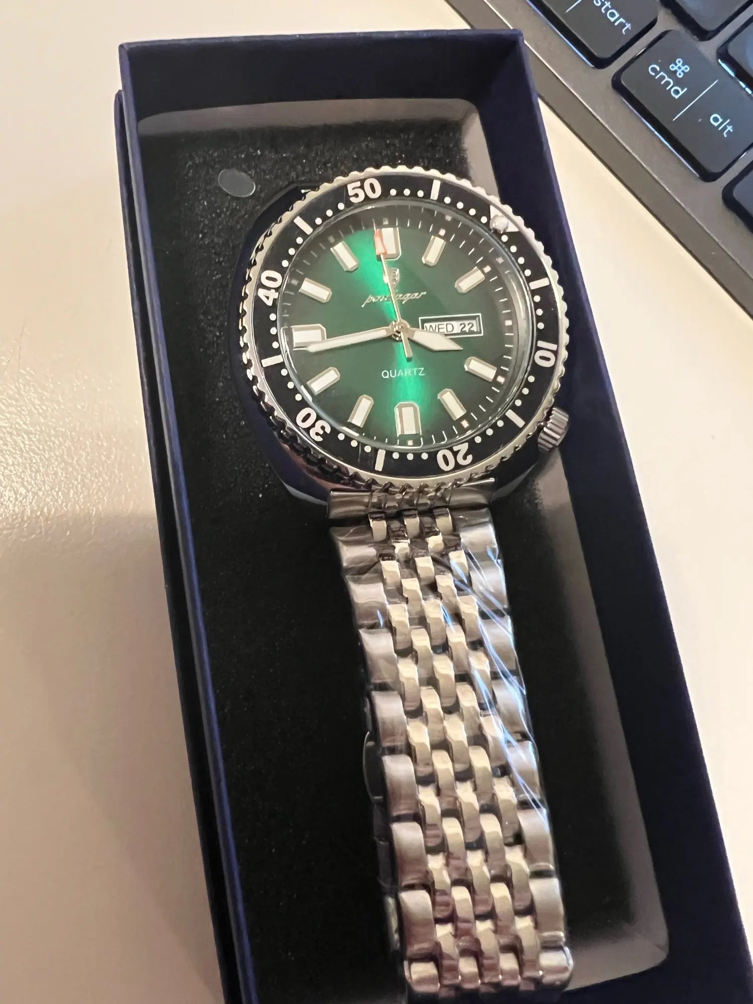 Surprised by the perceived quality of the watch, good weight, very elegant green colors. Very well packaged with plastics and box. Only thing is the strap, I had already read about it and ordered a leather one which is perfect. Let's see now how long it lasts... if it works, I will buy more colors. For now, it's already worth it.