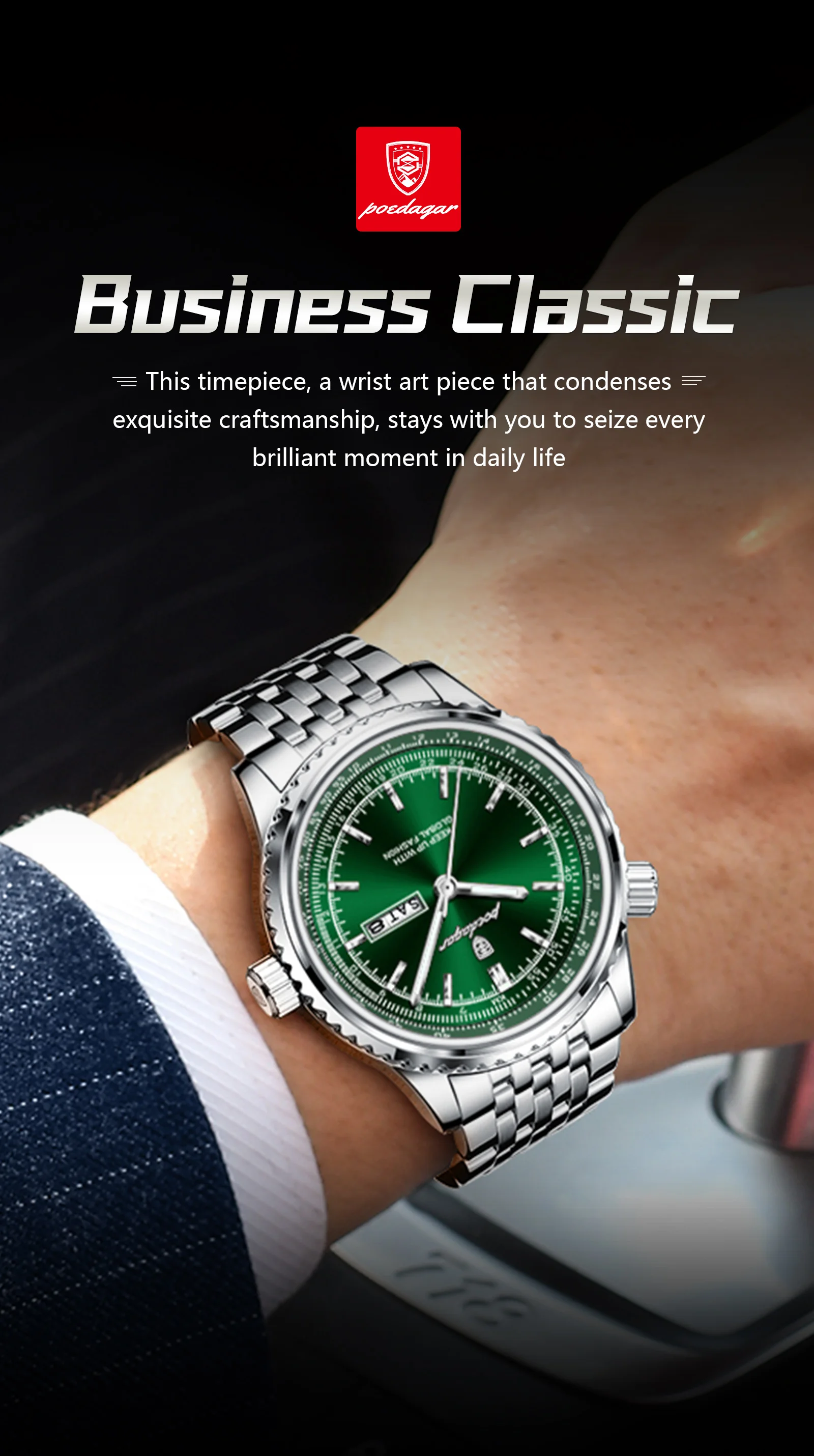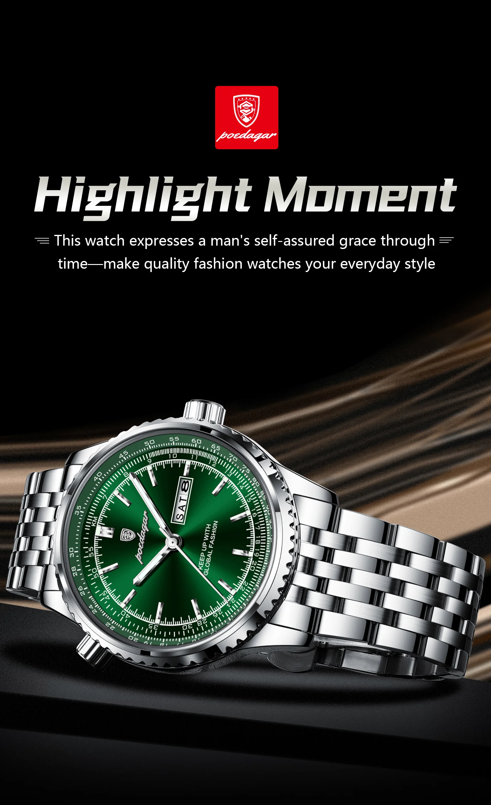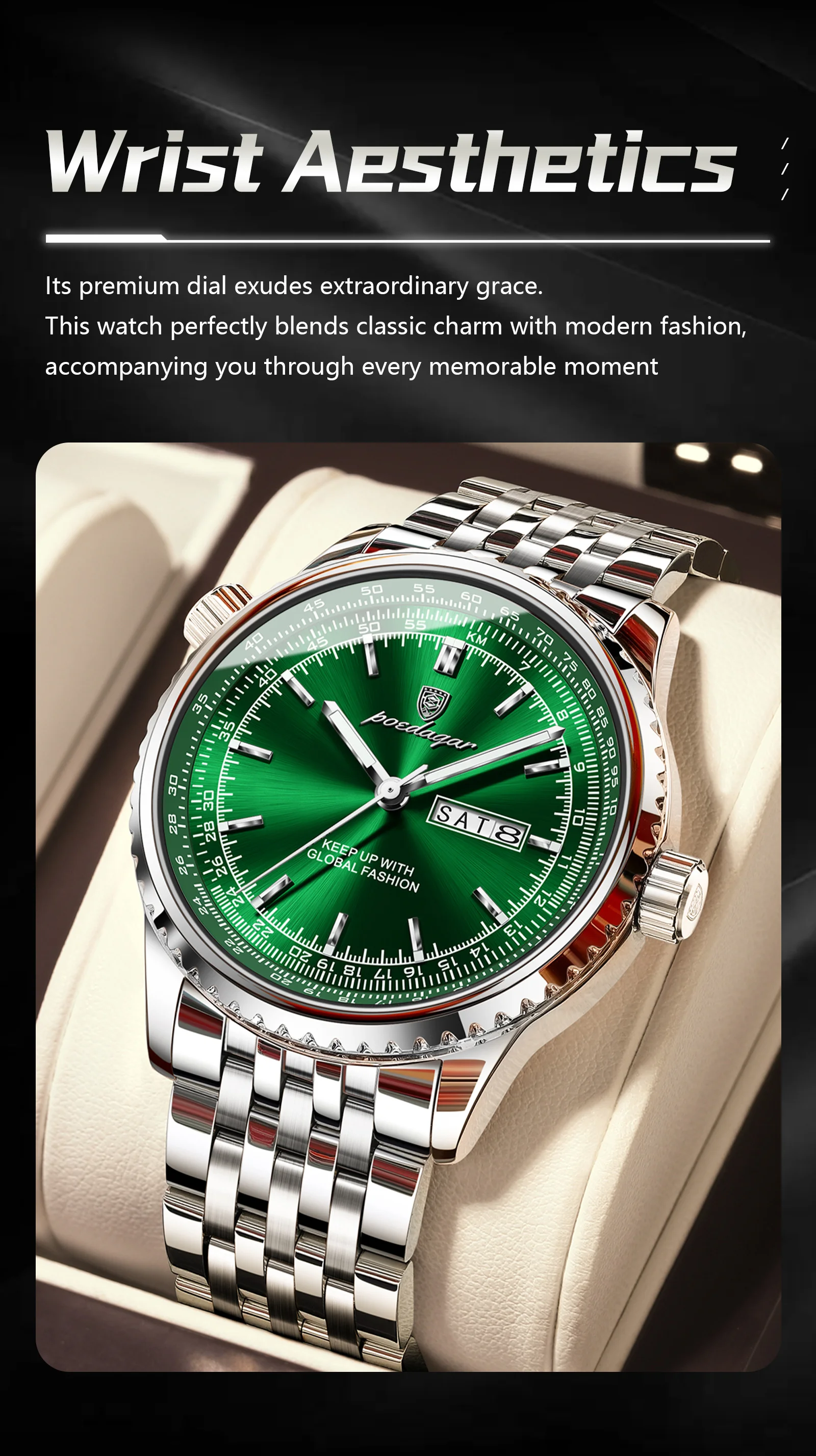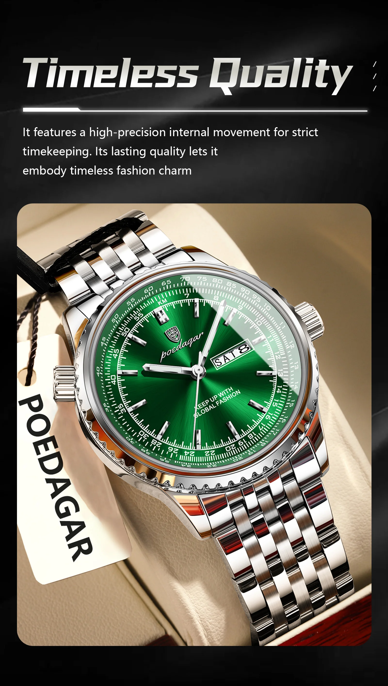 The Poedagar Commander Stainless Steel Luminous Quartz Men’s Watch delivers strength, accuracy, and sophistication in one striking timepiece. Its high-quality quartz movement ensures flawless timekeeping, while the luminous hands and markers provide clear visibility day or night. The stainless steel case and bracelet add durability and a refined finish, complemented by the convenient date and week functions. With its waterproof construction and military-inspired design, this watch is the perfect balance of elegance and endurance — ideal for men who lead with confidence and purpose.