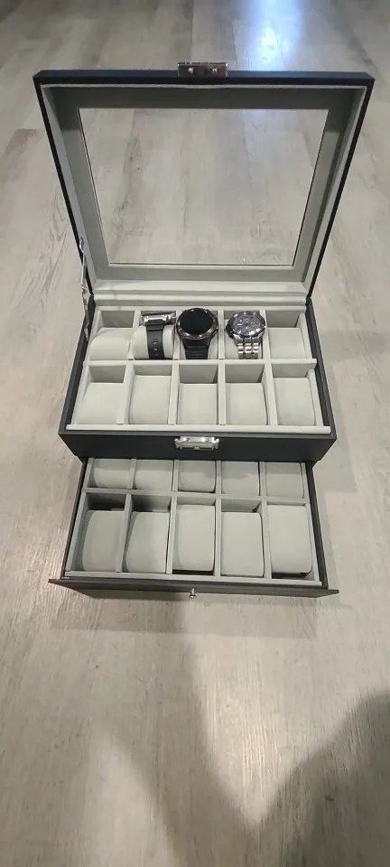 - [2 Layers, Large Capacity] This 2-layer watch box with 20 slots (10 slots per layer) offers plenty of storage space for your watches with a display size up to 48 mm. Also, you can remove the watch pillows to store your jewels