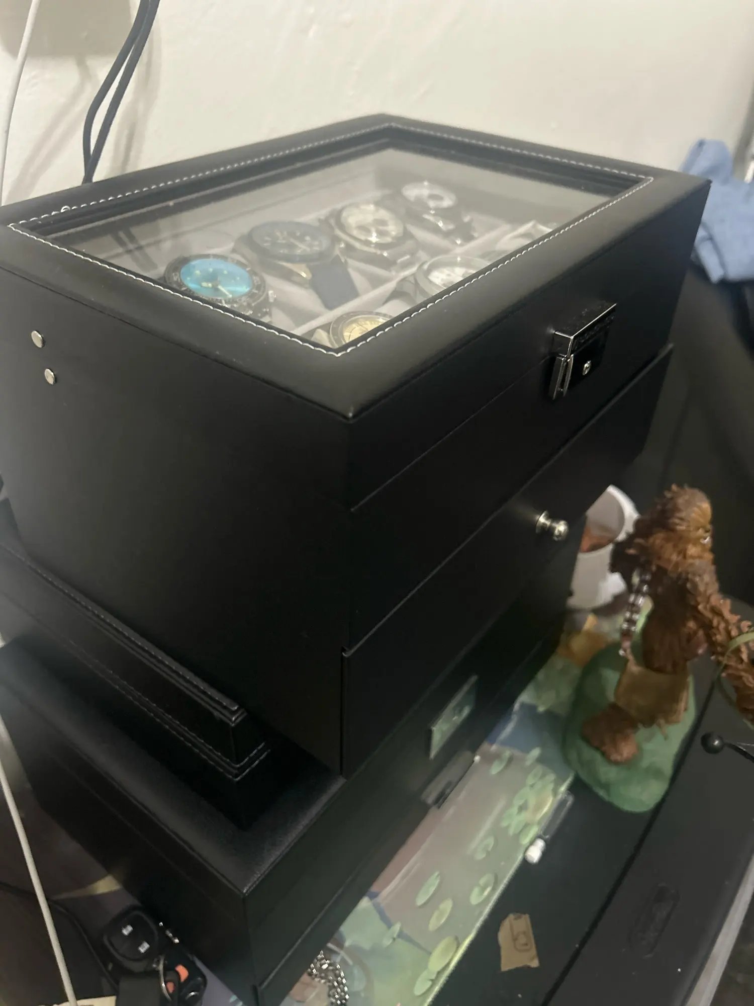 - [Large Glass Lid] This watch storage box comes with a large, clear glass top, so you can show off your watch collection, keep them away from dust, and find your fave instantly to save time on hectic mornings