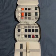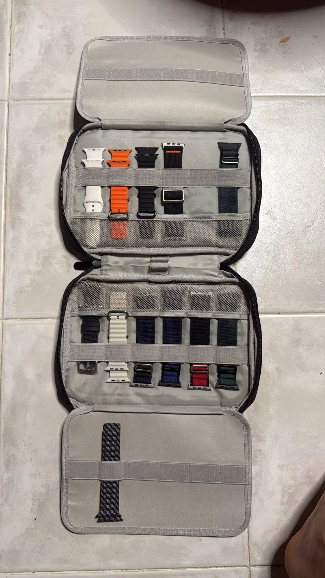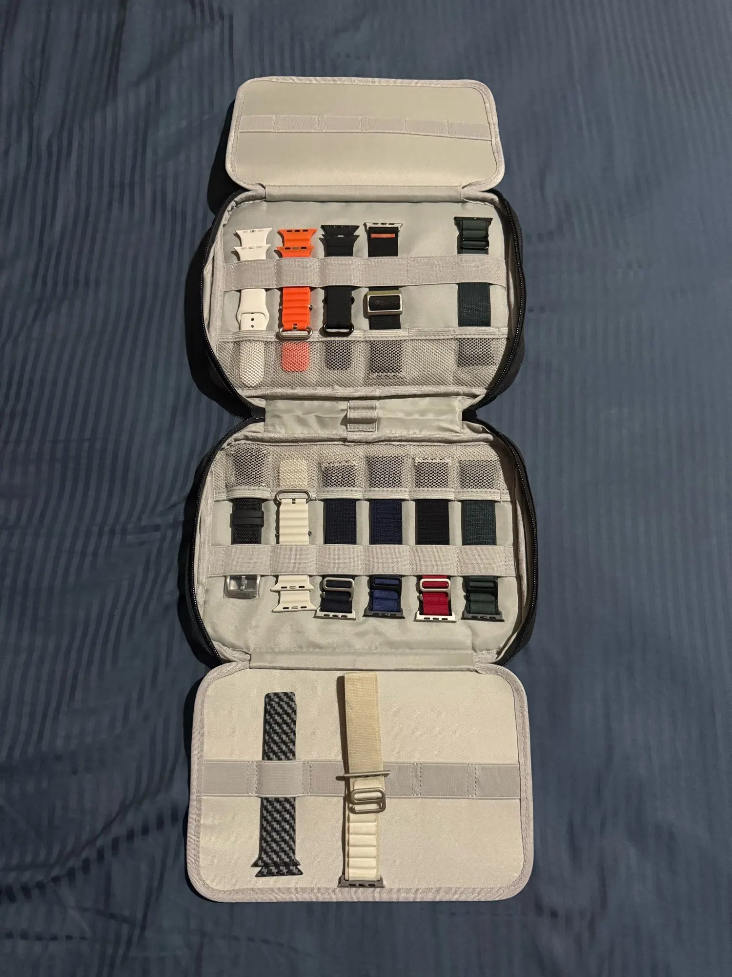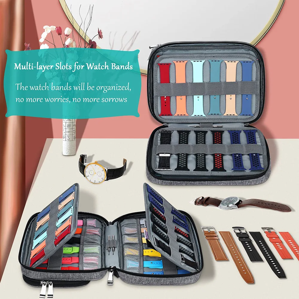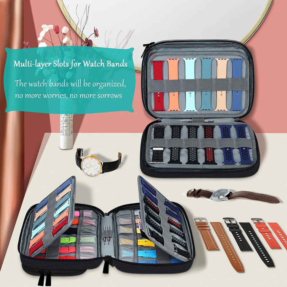 Large Capacity: 6 watchband panels with elastic loops, 2 of which are expandable panels, which can hold 36 watch bands, suitable for most size watch band. and 2 outer zippered pockets designed to place smartwatch, watchband accessories, charge cables, earphones, maximize the capacity of the watch bands bag.