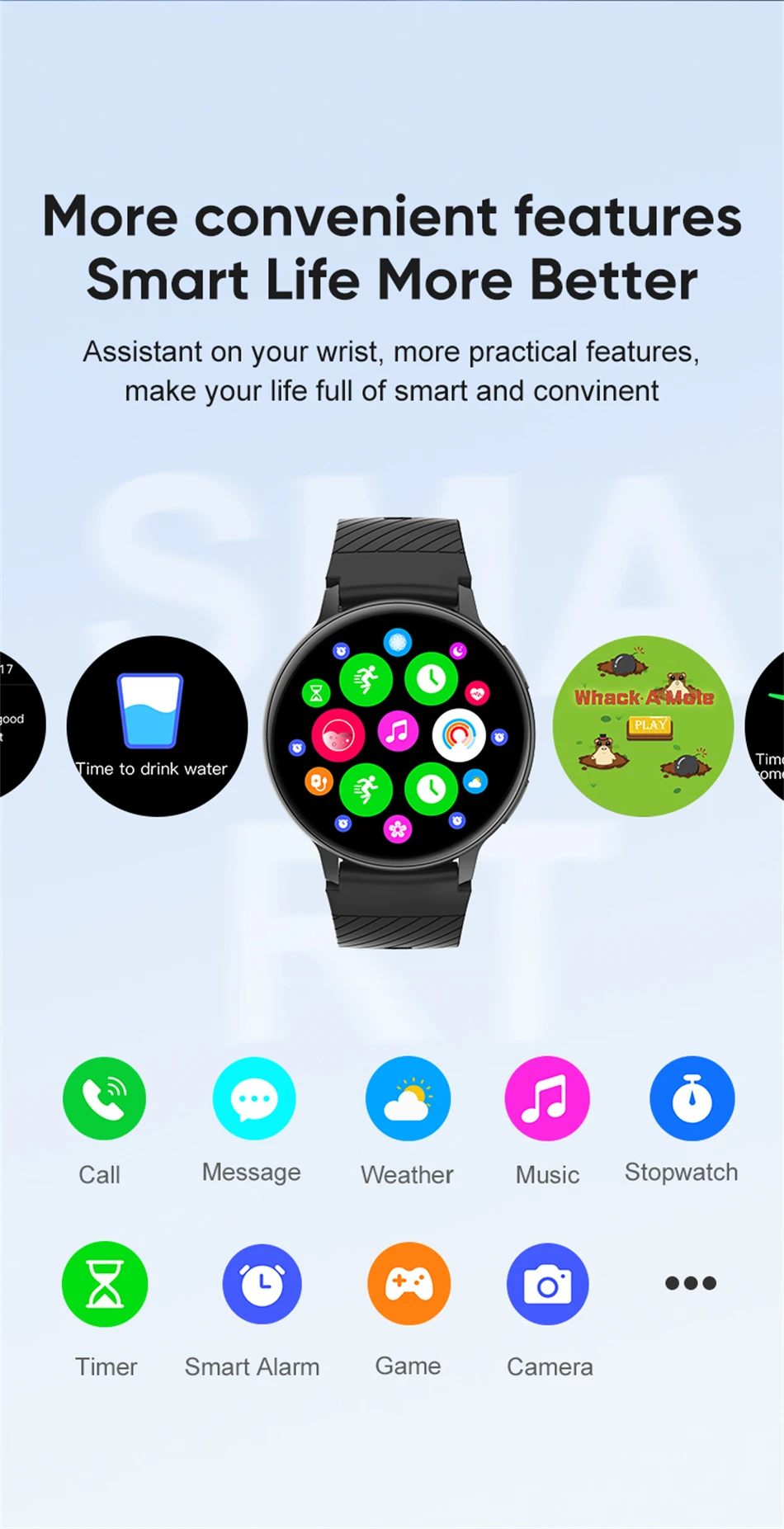 - IP68 daily-proof – swim, shower, rain, sweat safe; remote camera, music control, weather, alarm, stopwatch, find-phone.